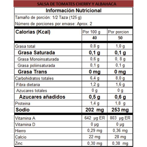 La siguiente tabla proporciona un ejemplo genérico de la información nutricional que podría encontrarse en una salsa de tomate. Los valores exactos pueden variar según la marca y la receta.